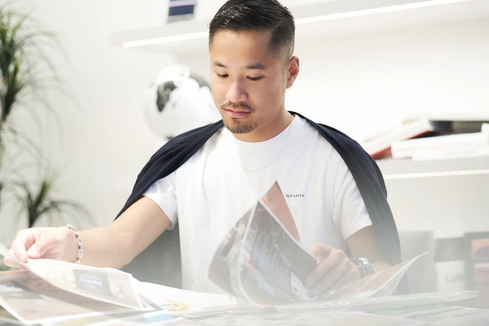 モード学園時代の思い出といえば、「グループ制作が印象深い」という。 「何事も自分で決めたいタチなので、たいていリーダーポジションに就いて陣頭指揮を執っていた」。そして「そうはいっても、賞をもらったことはなかったな。おそらく先を行き過ぎていたのだろう」と確信犯的に笑い、「それはさておき、一連のグループ制作を通じて人を束ねる極意を実践で学べた。社会に出てから、それがとても役に立っている」と続けた。 「特に部下を持つ立場になってからは、ひとり1人の性格や力量を見極め、うまく差配しながらチームを引っ張っていく統率力の重要性を強く認識している。そのベースになる部分を学生時代に培えたのは大きかったな、と」。 卒業後、TSIホールディングスの前身である、株式会社サンエー・インターナショナルに入社。当時、5次まであった試験を突破して内定を勝ち取り、メンズスーツブランドのデザインを担当することとなる。 大手アパレルメーカーで前途洋々のスタート、ところが待っていたのは「理想と現実のギャップ」という壁だった。 「会社としては当たり前のことだが、売るためのデザイン方針とやりたいことにズレを感じ始めて…」。 そして、悶々と悩み、転職も頭をよぎる中で訪れた転機が『PEARLY GATES』への異動である。 「もちろん『PEARLY GATES』とて、売らなければならないことに変わりはない。ただ、自分たちが着たいウェアをつくろう!から始まったブランドゆえに自由な発想を歓迎する土壌があり、マインドにフィットした」。 好調な業績も追い風となり、“イケイケどんどん”状態。 「その分仕事はハードだったが、やりたいことをやれる喜びは大きく、夢中になって仕事をするうちに10年が過ぎた」。