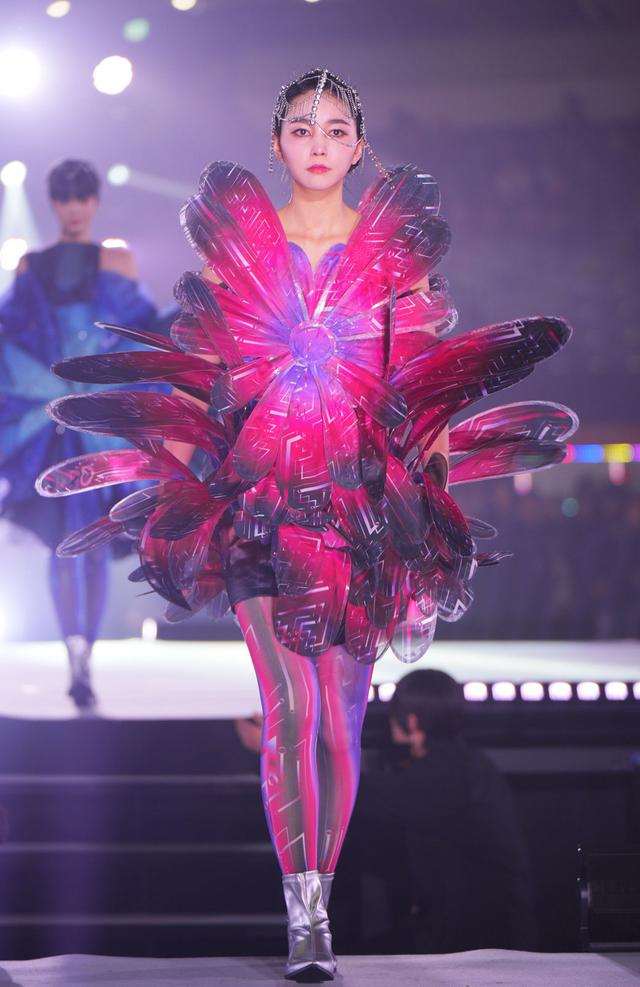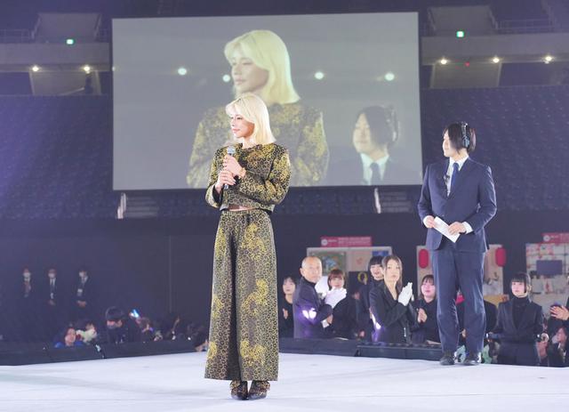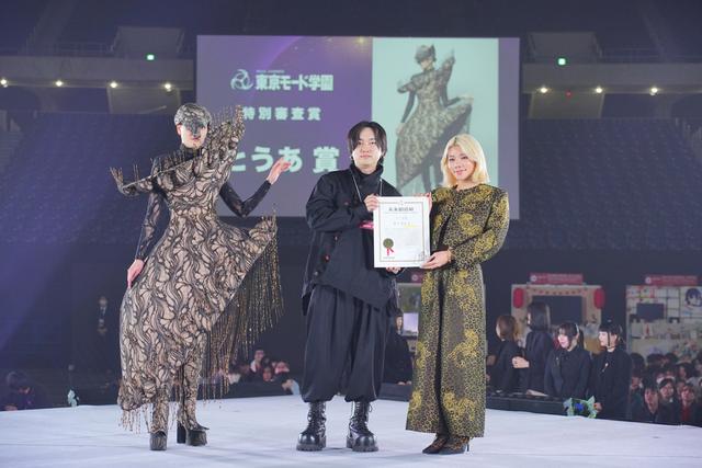 表彰式では、人気クリエイターのとうあさんが審査員として登壇。モード学園の学生が制作した衣装で登場し、ラグジュアリー感のある衣装がとうあさんの輝きをさらに際立たせていました。とうあさんは衣装について、「私が好きな柄で、体のラインも綺麗にでている点がとても気に入りました」とコメント。とうあ賞に選ばれた作品については、「強さが伝わってきて、作り手のエネルギーや感情が伝わってきました。本当にどれも素敵な作品ばかりで、皆さんの今後の作品にも期待しています」と講評を述べました。