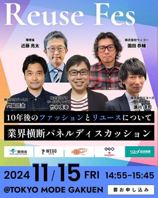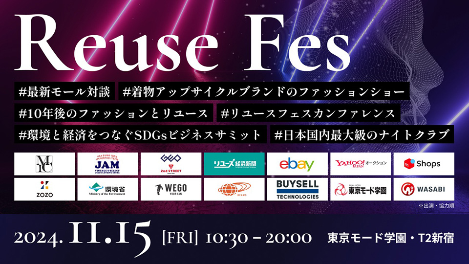 東京モード学園では、株式会社ワサビが事務局を務める「リユースフェス事務局」と連携し、ファッション業界のパイオニア達による持続可能なファッションを学ぶ「リユースフェス」を開催します。